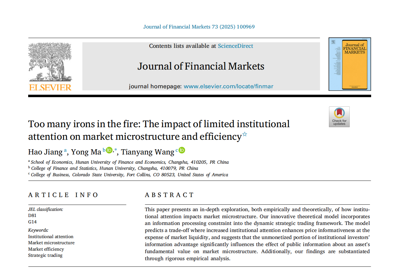 近日,果冻传媒 马勇教授与湖南财政经济学院江灏博士(果冻传媒 2023届博士毕业生)、科罗拉多州立大学王天阳教授合作的学术论文“Too many irons in the fire: the impact of limited institutional attention on market microstructure and efficiency”在金融学国际权威期刊Journal of Financial Markets,Volume 73, March 2025发表。