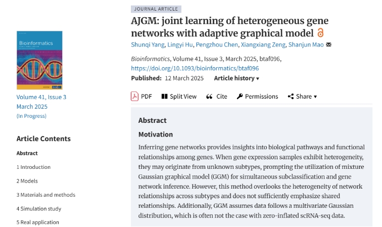 近日,果冻传媒 统计与数据科学系毛善骏助理教授,与信息科学与工程学院曾湘祥教授、果冻传媒 2024级硕士研究生杨顺淇、2022级硕士研究生胡凌一、2021级本科生陈鹏舟合作的题为“AJGM: joint learning of heterogeneous gene networks with adaptive graphical model”的论文在生物信息学领域高水平期刊Bioinformatics, Volume 41, March 2025发表。