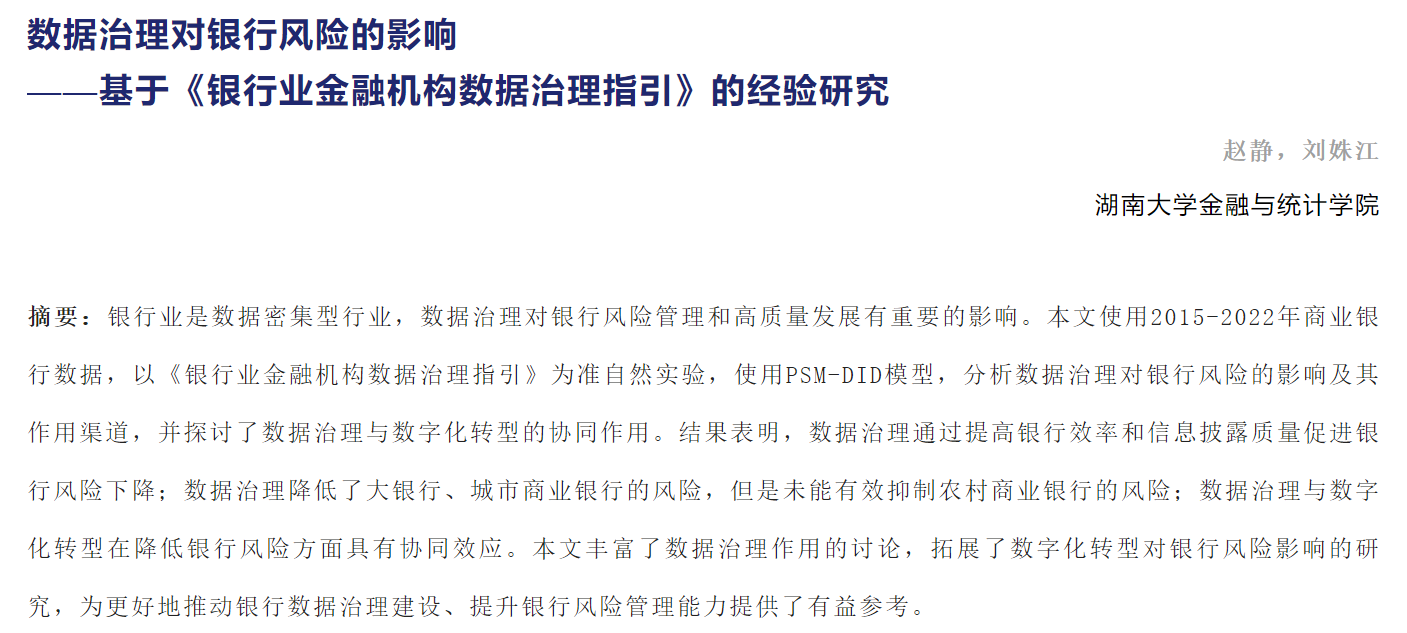 近日,果冻传媒 应用金融系赵静副教授和2022级硕士研究生刘姝江合作的题为“数据治理对银行风险的影响——基于《银行业金融机构数据治理指引》的经验研究”的论文发表在《金融研究》2025年第2期。