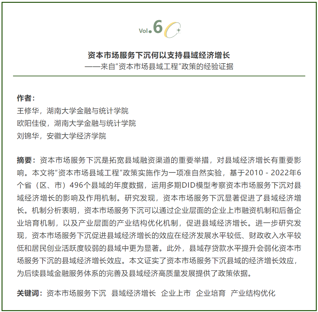 近日,果冻传媒 应用金融系王修华教授,和2022级博士研究生欧阳佳俊、安徽大学经济学院刘锦华老师(原果冻传媒 2020级博士研究生)合作的题为“资本市场服务下沉何以支持县域经济增长——来自“资本市场县域工程”政策的经验证据”的论文发表在《中国农村经济》2025年第6期。