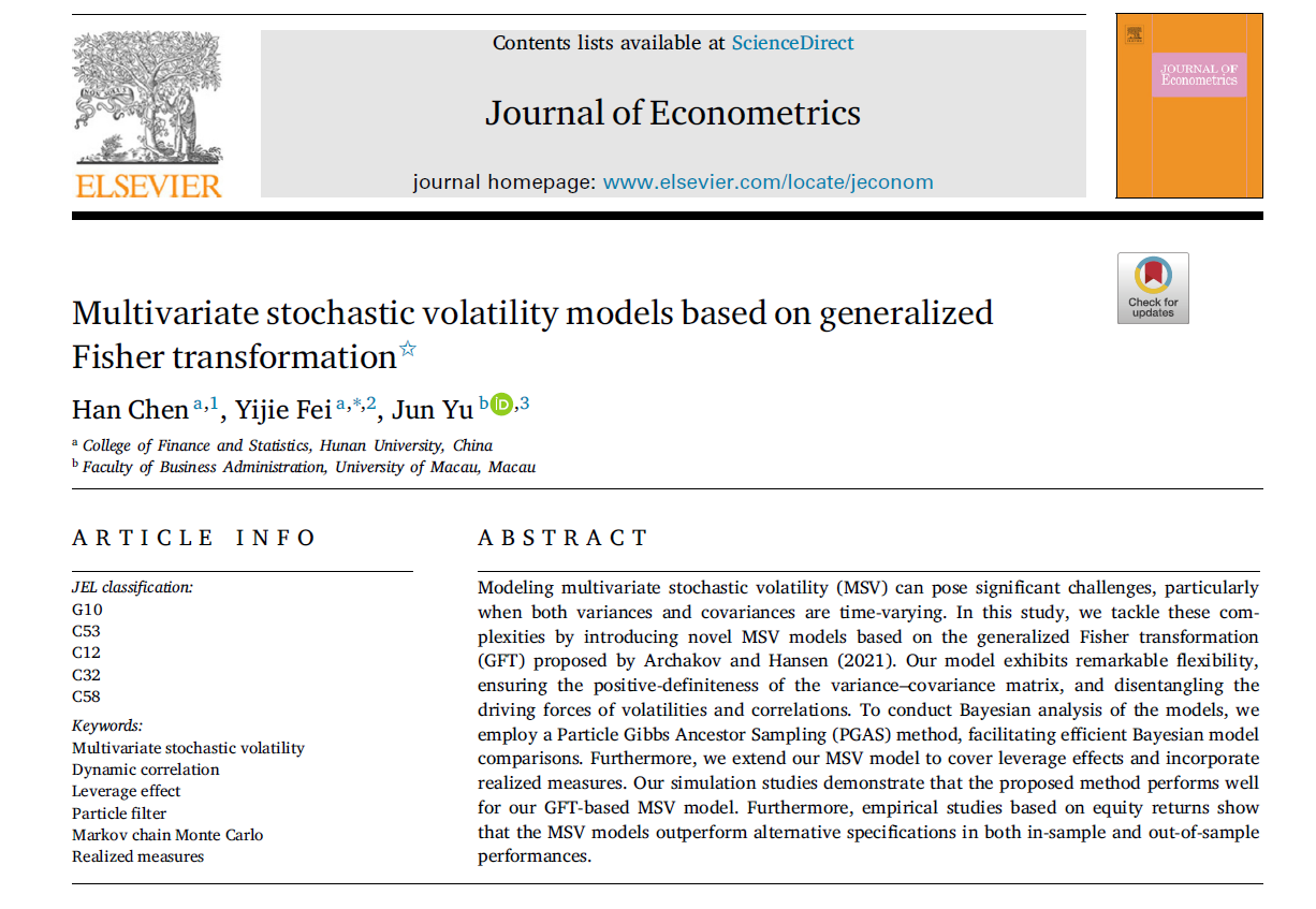 近日,果冻传媒 陈汉助理教授、费毅捷助理教授与澳门大学余俊教授合作完成的学术论文“Multivariate stochastic volatility models based on generalized Fisher transformation”在计量经济学国际顶尖期刊Journal of Econometrics在线发表。果冻传媒 陈汉助理教授为该文第一作者,费毅捷助理教授为该文通讯作者。
