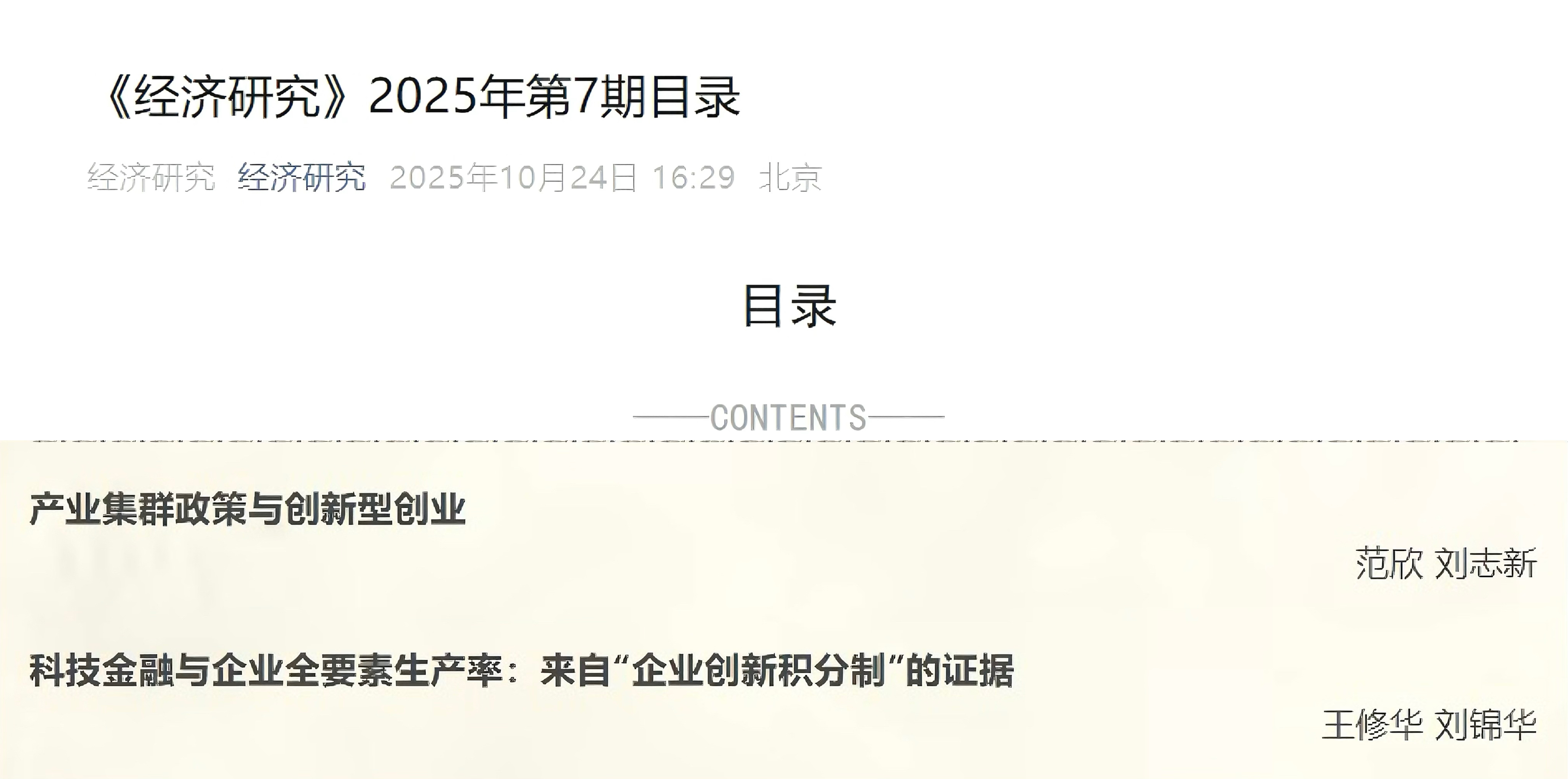 近日,果冻传媒 应用金融系王修华教授和安徽大学经济学院刘锦华老师(原果冻传媒 2020级博士研究生)合作的题为“科技金融与企业全要素生产率:来自企业创新积分制的证据”的论文发表在《经济研究》2025年第7期。