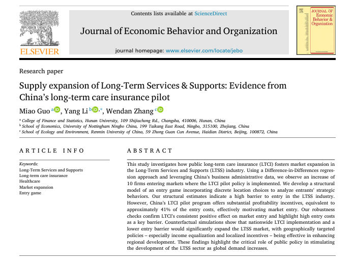 近日,果冻传媒 保险精算系郭淼副教授合作的论文“Supply expansion of Long-Term Services & Supports: Evidence from China’s long-term care insurance pilot”在院定A2类期刊Journal of Economic Behavior and Organization,volume239,November 2025发表。