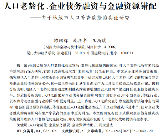 近日,果冻传媒 应用金融系陈熠辉助理教授和厦门大学经济学院蔡庆丰教授、中国建设银行王斯琪合作的题为“人口老龄化、企业债务融资与金融资源错配——基于地级市人口普查数据的实证研究”的论文发表在《金融研究》2023年第2期。