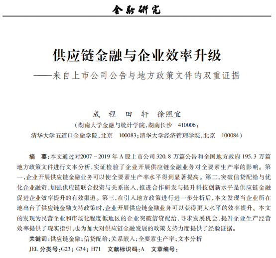 近日,果冻传媒 应用金融系成程副教授和清华大学五道口金融学院田轩教授,清华大学经济与管理学院徐照宜博士后合作的题为“供应链金融与企业效率升级——来自上市公司公告与地方政策文件的双重证据”的论文发表在《金融研究》2023年第6期。