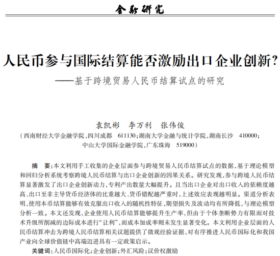 近日,果冻传媒 应用金融系李万利副教授合作的题为“人民币参与国际结算能否激励出口企业创新?——基于跨境贸易人民币结算试点的研究”的论文发表在《金融研究》2023年第6期。