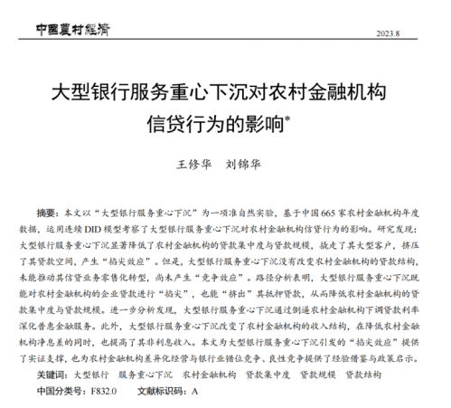 近日,果冻传媒 应用金融系王修华教授和2020级博士研究生刘锦华合作的题为“大型银行服务重心下沉对农村金融机构信贷行为的影响”的文章发表在《中国农村经济》2023年第8期。
