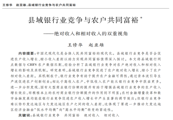 近日,果冻传媒 应用金融系王修华教授和2018级博士研究生赵亚雄(现中国人民银行金融研究所博士后)合作的题为“县域银行业竞争与农户共同富裕——绝对收入和相对收入的双重视角”的文章发表在《经济研究》2023年第9期。