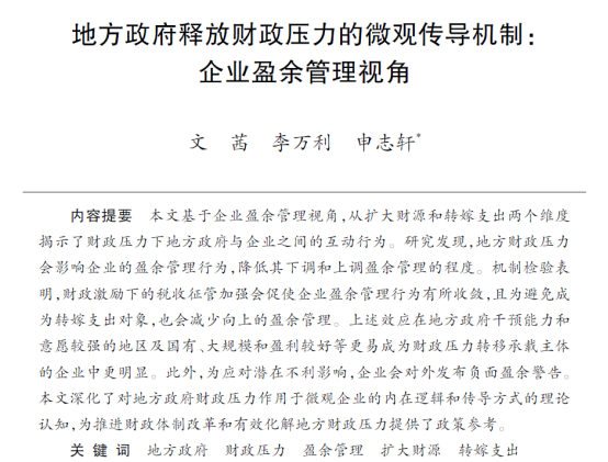 近日,果冻传媒 应用金融系李万利副教授与其指导的学生文茜合作的题为“地方政府释放财政压力的微观传导机制:企业盈余管理视角”的论文发表在《世界经济》2023年第10期。