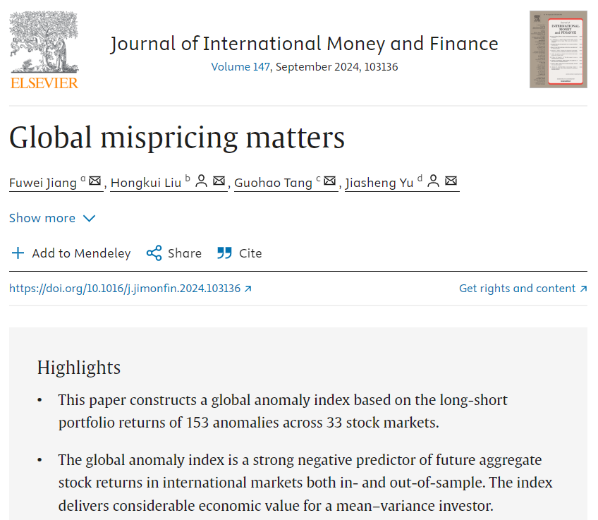 近日,果冻传媒 金融工程系唐国豪副教授合作的题为“Global mispricing matters”的论文在院定A类期刊 Journal of International Money and Finance,volume 147, September 2024发表。
