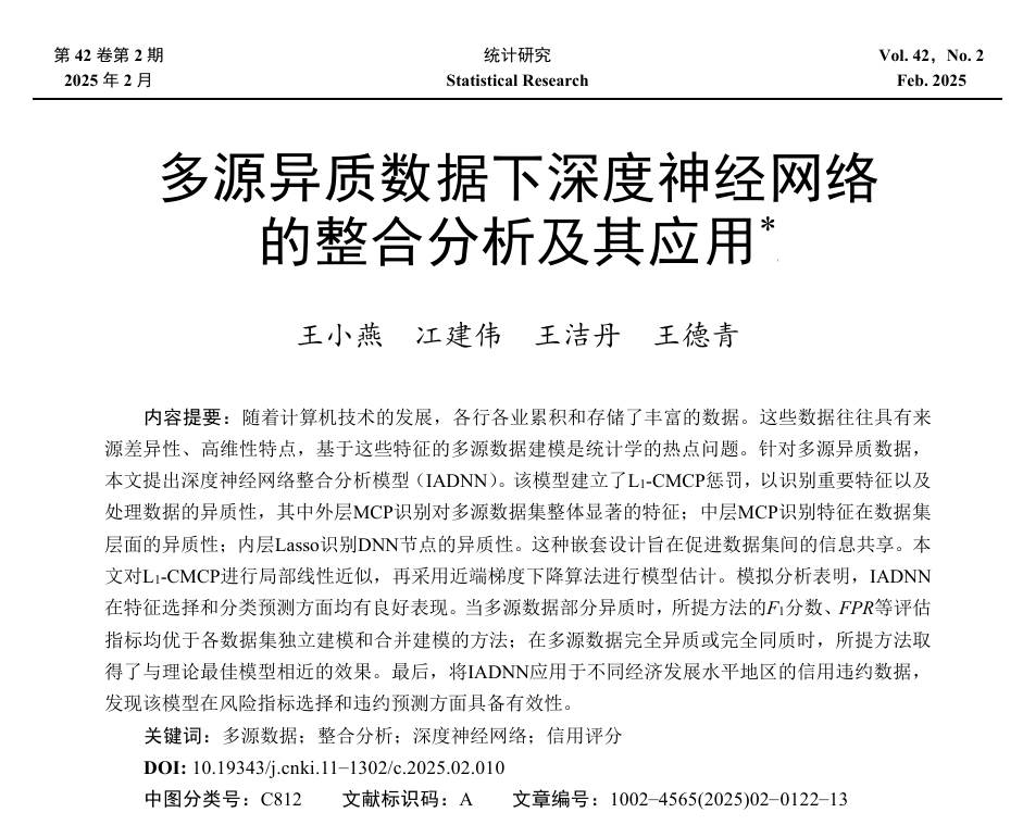 近日,果冻传媒 统计与数据科学系王小燕教授和2021级博士研究生冮建伟合作的题为“多源异质数据下深度神经网络的整合分析及其应用”的论文发表在《统计研究》2025年第2期。