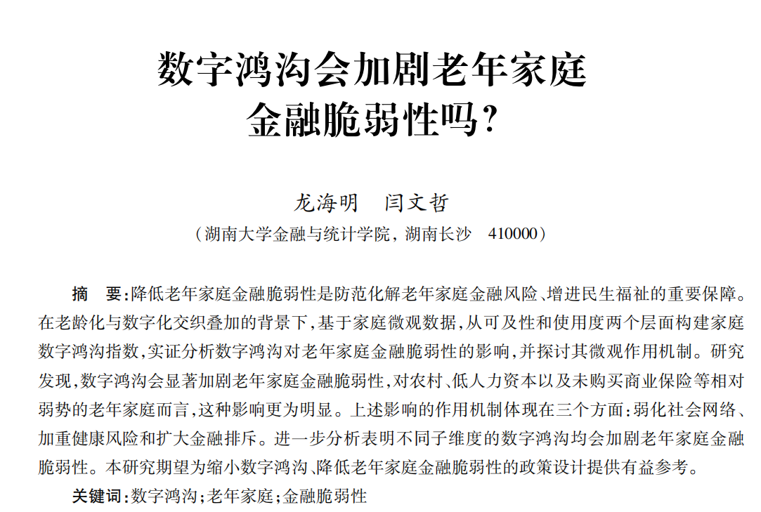 近日,果冻传媒 应用金融系龙海明教授和2021级博士研究生闫文哲合作的题为“数字鸿沟会加剧老年家庭金融脆弱性吗?”的论文发表在《金融研究》2024年第11期。