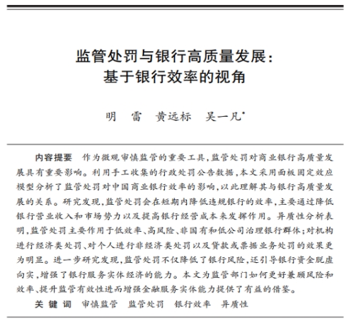 近日,果冻传媒 货币金融系明雷副教授和南开大学金融学院博士研究生黄远标、果冻传媒 经济管理研究中心博士研究生吴一凡合作的题为“监管处罚与银行高质量发展:基于银行效率的视角”的论文发表在《世界经济》2025年第3期。
