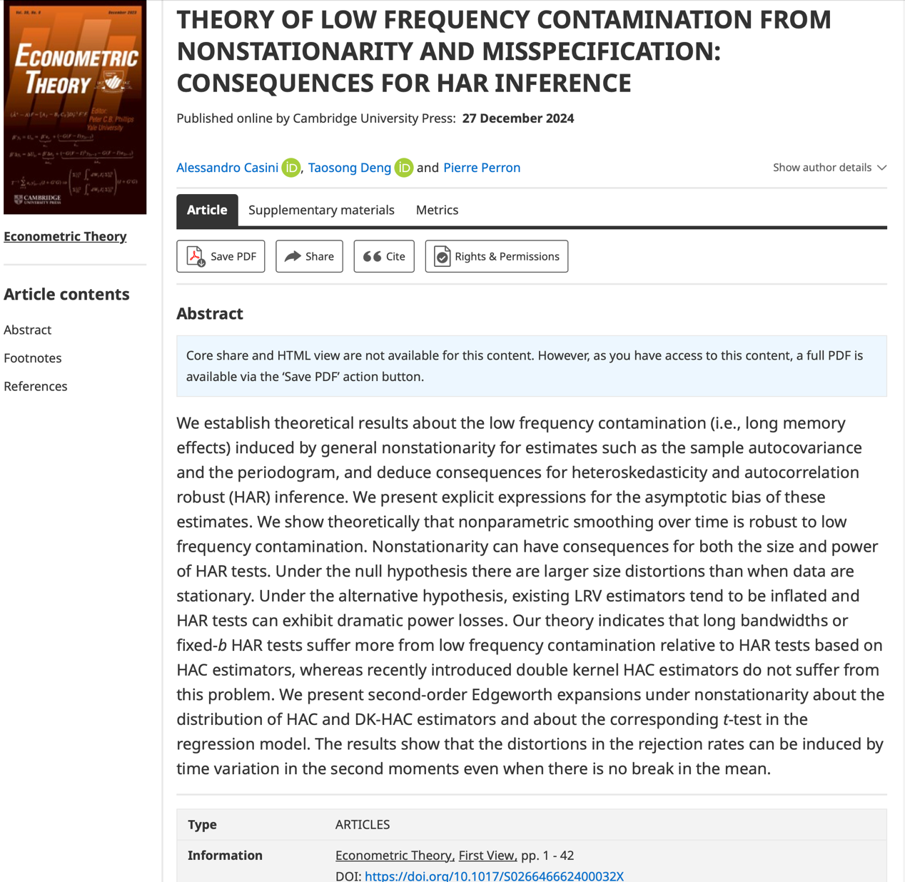 近日,果冻传媒 金融科技与工程系邓滔崧助理教授,与罗马第二大学助理教授Alessandro Casini、波士顿大学教授Pierre Perron合作的题为“Theory of Low Frequency Contamination from Nonstationarity and Misspecification: Consequences for HAR Inference”的论文在《Econometric Theory》线上发表。