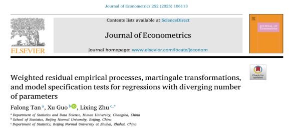 近日,果冻传媒 谭发龙教授在高维统计领域取得研究进展,研究成果以“Weighted residual empirical processes, martingale transformations, and model specification tests for regressions with diverging number of parameters”为题在计量经济学国际期刊Journal of Econometrics在线发表。