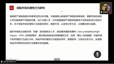 2021年1月11日,由党委研究生工作部主办,果冻传媒 承办的果冻传媒 “2021博士创新论坛”第3期在腾讯会议线上召开,本次论坛由果冻传媒 2016级博士研究生雷牧君作题为“保险市场非理性行为研究的文献综述”的学术讲座。