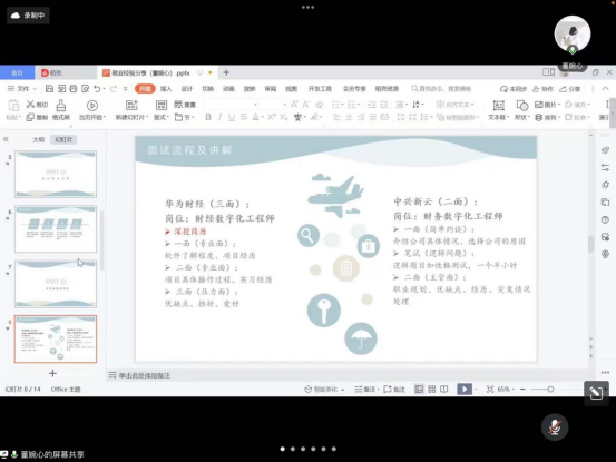 成功应聘华为公司的董婉心学姐主要为同学们介绍了就业信息的收集,分享面试经验及准备。她分享了自己面试华为财经公司的经历,强调一些基础软件,如Python、R的学习掌握了会给面试带来一定优势。其次在简历的准备中要确保内容透彻清楚,体现出能胜任岗位的能力,突出核心竞争力。
