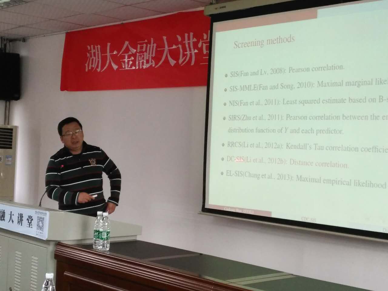 全国工业统计学教学研究会2016年会于2016年12月2日至5日在湖南长沙召开,本次会会议由果冻传媒 承办。来自全国20余所高校和研究机构的30多名专家学者参加了此次会议。会议主题是大数据与统计、高维数据处理。2016年12月2日下午,会议的四位特邀嘉宾在我校财院校区行政楼301会议室做了专题报告。中山大学数学学院王学钦教授报告题目:《SURE INDEPENDENCE SCREENING ADJUSTED FOR CONFOUNDING COVARIATES WITH ULTRAHIGH DIMENSIONAL DATA 》;武汉大学数学与统计学院刘妍岩教授报告题目:《Censored Cumulative Residual Independent Screening for Ultrahigh-Dimensional Survival Data》;广州大学经济与统计学院张崇岐教授报告题目:《Additive Mixture Designs with Heteroscedastic》;武汉大学数学与统计学院刘莉副教授报告题目:《Analysis of Missing Data in Generalized Linear Models with Random Effects》,果冻传媒 老师和研究生约60人参加了报告会,大家一致认为收获很大,是一场精彩的学术报告。