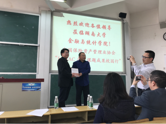 致辞结束之后,刘传葵副秘书长向果冻传媒 赠送了《课题专著》,聂国军书记向中国保险资产管理业协会赠送了《岳麓书院学规》。