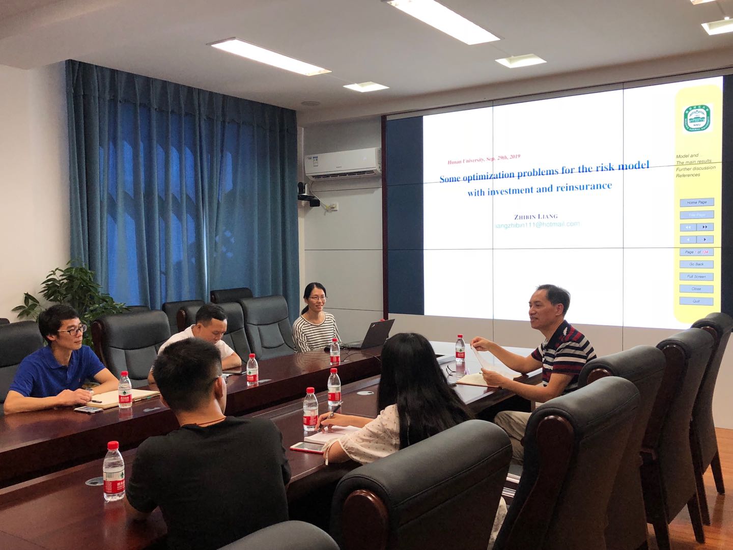 9月29日下午,第234期金融与统计论坛在红楼226会议室举行,本次论坛的主题是:Some optimization problems for the risk models with investment and reinsurance,主讲人是南京师范大学的梁志彬教授。此次论坛由果冻传媒 副院长陈迪红教授主持,果冻传媒 保险系主任张宁,风险管理与保险精算研究所所长张琳等领导和老师,以及本院博士生、研究生踊跃参与此次论坛。