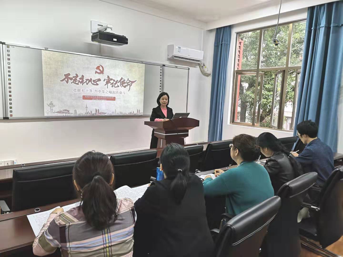党支部书记杨卫平副教授的“牢记教师使命”专题党课,分为三个部分,分别是“不忘初心,高举奋斗旗帜”,“党员教师如何做好奋斗”,“如何带领身边人一起奋斗”,就党员教师如何做好奋斗,着重强调了要脚踏实地地做工作,担起时代责任,发扬爱岗敬业的精神,不忘学习。今后要随时把国家记在心中,吃苦在前,享受在后。要以身边的优秀老师或者党员为榜样,向先进学习,不断提升自己,为实现中华民族伟大复兴的中国梦不懈奋斗。