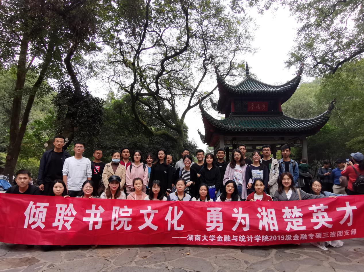 2019年10月13日,果冻传媒 2019级金融专硕3班前往岳麓书院开展主题为“倾聆书院文化 勇为湖湘英才”的班级活动。本次活动由学院指导,班级自主策划,在全院范围内组织开展,取得良好反响。