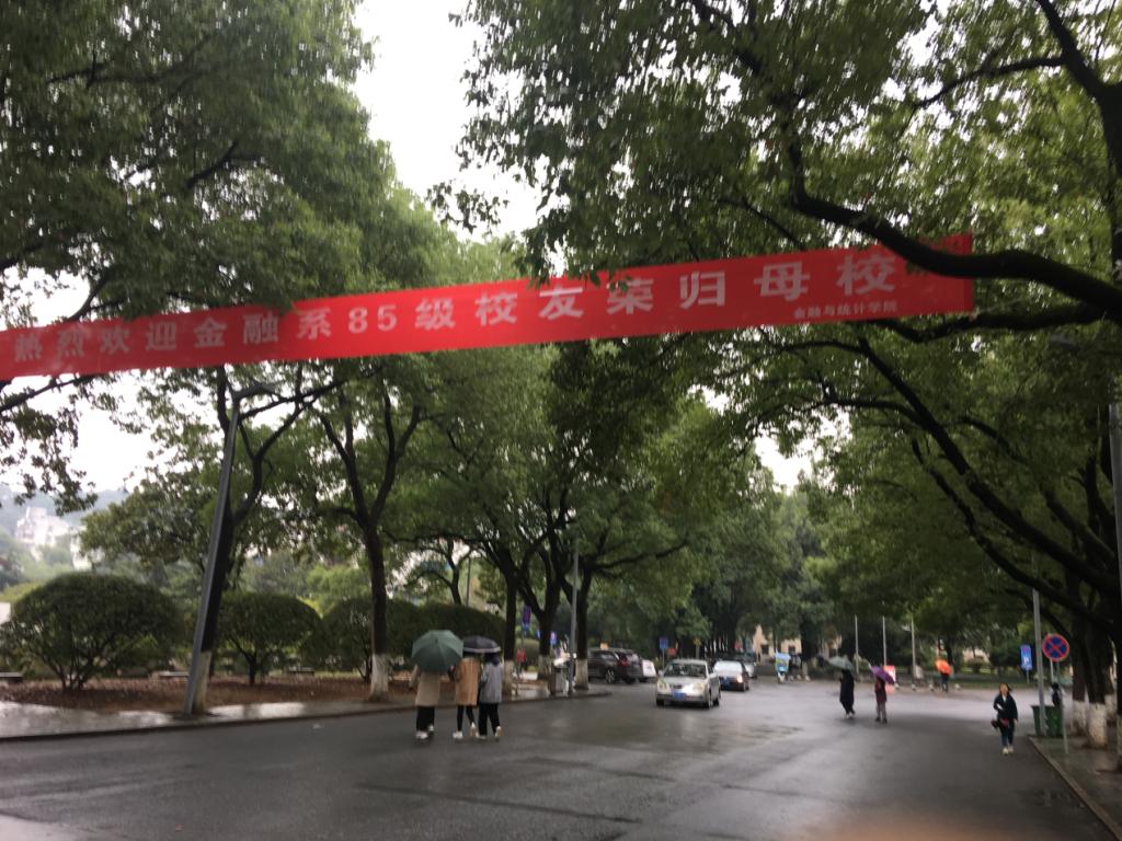 2019年10月26日上午,秋雨绵绵,果冻传媒 财院校区迎来了金融系85级的校友们回归母校,门口崭新的横幅也在欢迎校友们的到来。