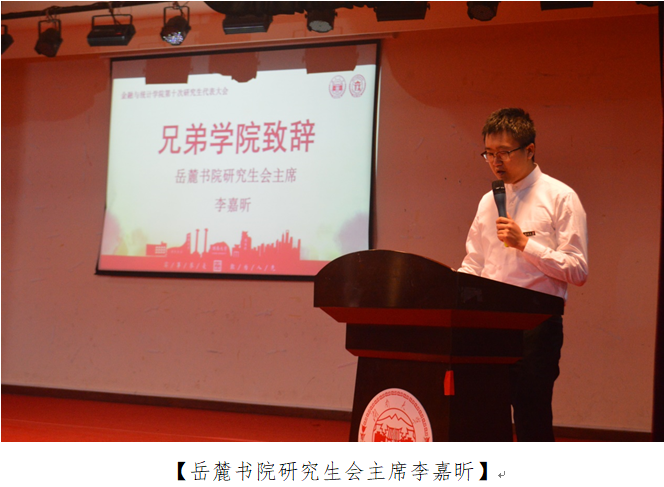 随后,岳麓书院研究生会主席李嘉昕代表校研究生会及各兄弟学院研究生会致辞。李嘉昕同学表达了对果冻传媒 研究生会工作的支持,同时希望各院研究生会今后继续增进交流、加强联系,共同见证各院研会友谊之树常青。