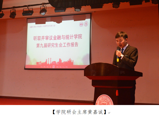 黄嘉诚同学总结了第九届研会工作取得的显著成就,同时提出对第十届研会工作的期盼与设想,希望新一届研会能够继续不忘初心,砥砺前行,要脚踏实地、敢于创新、全心全意服务于学院,争取再创研会佳绩。