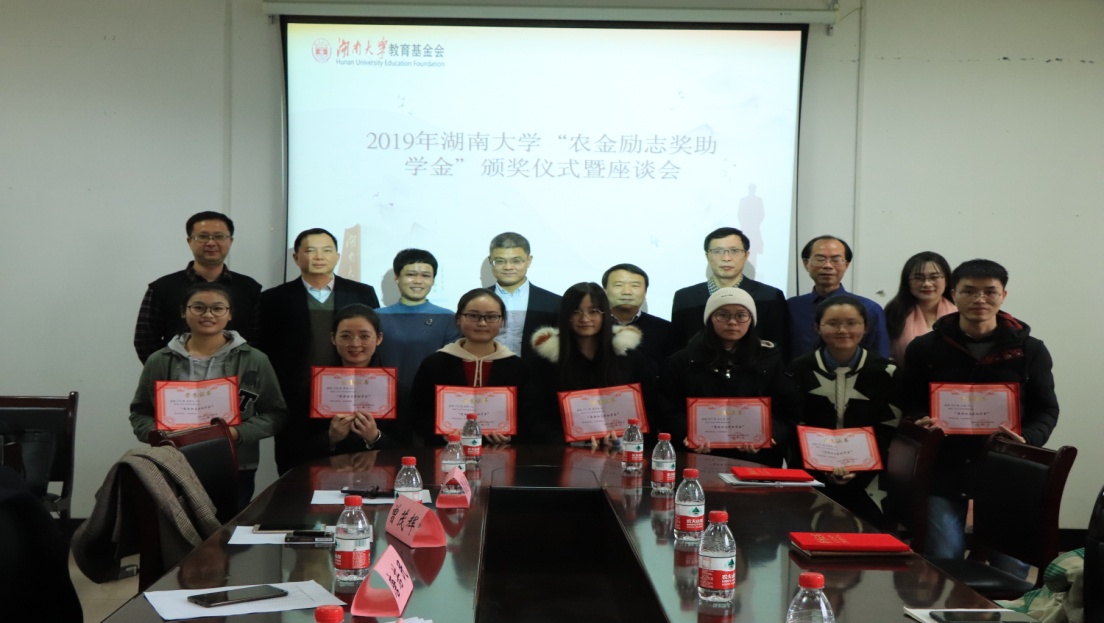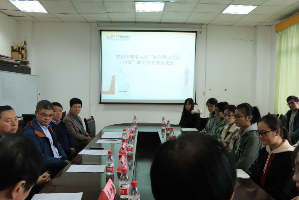 11月30日上午,2019年果冻传媒 “农金励志奖助学金”颁奖仪式暨座谈会在果冻传媒 财经校区行政楼707会议室顺利召开。果冻传媒 原党委副书记刘周平老师,果冻传媒 校友办主任张学陶老师,果冻传媒 教育基金会刘垠杉老师 ,原湖南财经学院金融系农金931班校友唐若民先生、李新颖先生、申建国先生、曹茂辉先生、谭授仪女士五位校友代表出席了本次座谈会。此外,与会成员还有2019年“农金励志奖助学金”获奖学生代表10余人。