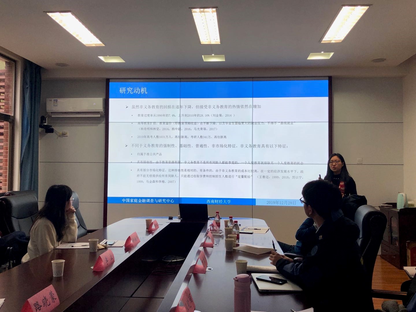 西南财经大学的路晓蒙博士报告的题目是《非义务教育与家庭资产配置》,此文主要是在非义务教育回报逐年下降的背景下,将扭曲家庭资产配置定义为非义务教育的间接成本,并且在此基础上,进一步测度了非义务教育对家庭资产流动性、风险性的影响,及其受不同收入和教育背景家庭影响的异质性。