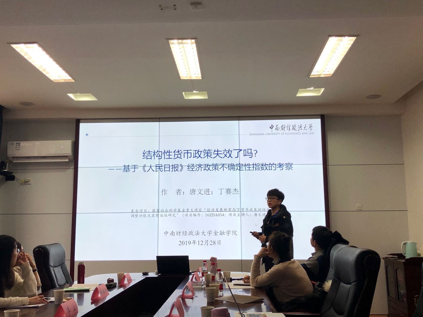 中南财经政法大学丁赛杰硕士报告的题目是《结构性货币政策失效了吗?--基于〈人民日报〉经济政策不确定性指数的考察》,文章对结构性货币政策进行探究,并得出保持经济政策的稳定性、增强市场信心是结构性货币政策充分发挥作用的重要前提。随后,果冻传媒 教授喻旭兰老师对文章进行点评,并提出了建设性的意见。