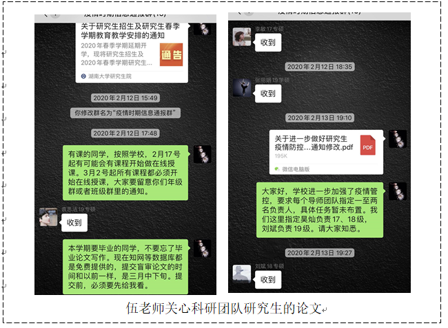 不仅如此,疫情防控期间,伍老师对于研究生的论文指导也十分上心,不愧是先后四次获得“果冻传媒 毕业设计(论文)优秀指导老师”称号的优秀教师。目前,伍老师正在指导15位研究生,其中不乏即将毕业的数名研究生。疫情防控期间,伍老师多次运用邮件、微信指导各位研究生的论文,孜孜不倦地教育着祖国未来的建设者。