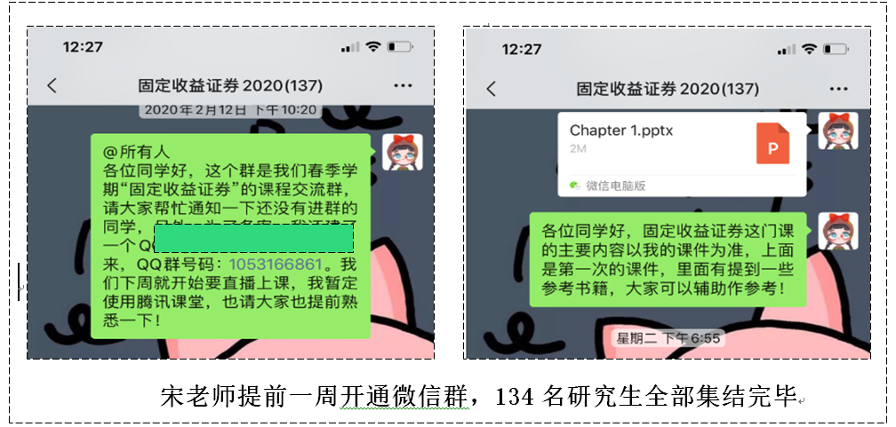虽然面向研究生的《固定收益证券》课程2月20日(周四)才开课,但早在2月12日,宋老师就通过微信群将果冻传媒 134位研究生们组织了起来。2月17日(《固定收益证券》课程开课前3天),宋老师就提前将相关的课件发送给研究生们,以供他们预习。