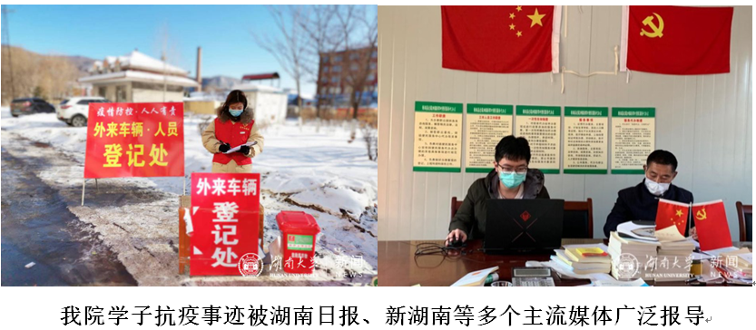 抗疫期间,在加强自我防护,自律学习的同时,学院2019级本科生刘艺主动申请在家乡吉林省白山市江源区做防疫志愿者,主要负责在其所在地市人流量较大的路段进行疫情防控知识的宣传、来往车辆及人员信息的登记和体温监测等工作。2019级硕士研究生谢聪在湖南省衡阳市衡南县近尾洲镇新育村担任疫情防卫志愿者,志愿期间,谢聪积极向村民宣传防疫知识,统计每日进出村的人员信息,并帮助村委会整理资料向上级部门汇报情况,工作尽职尽责。春寒料峭,金统学子的青春在为国家为人民的奋斗中尽情绽放。