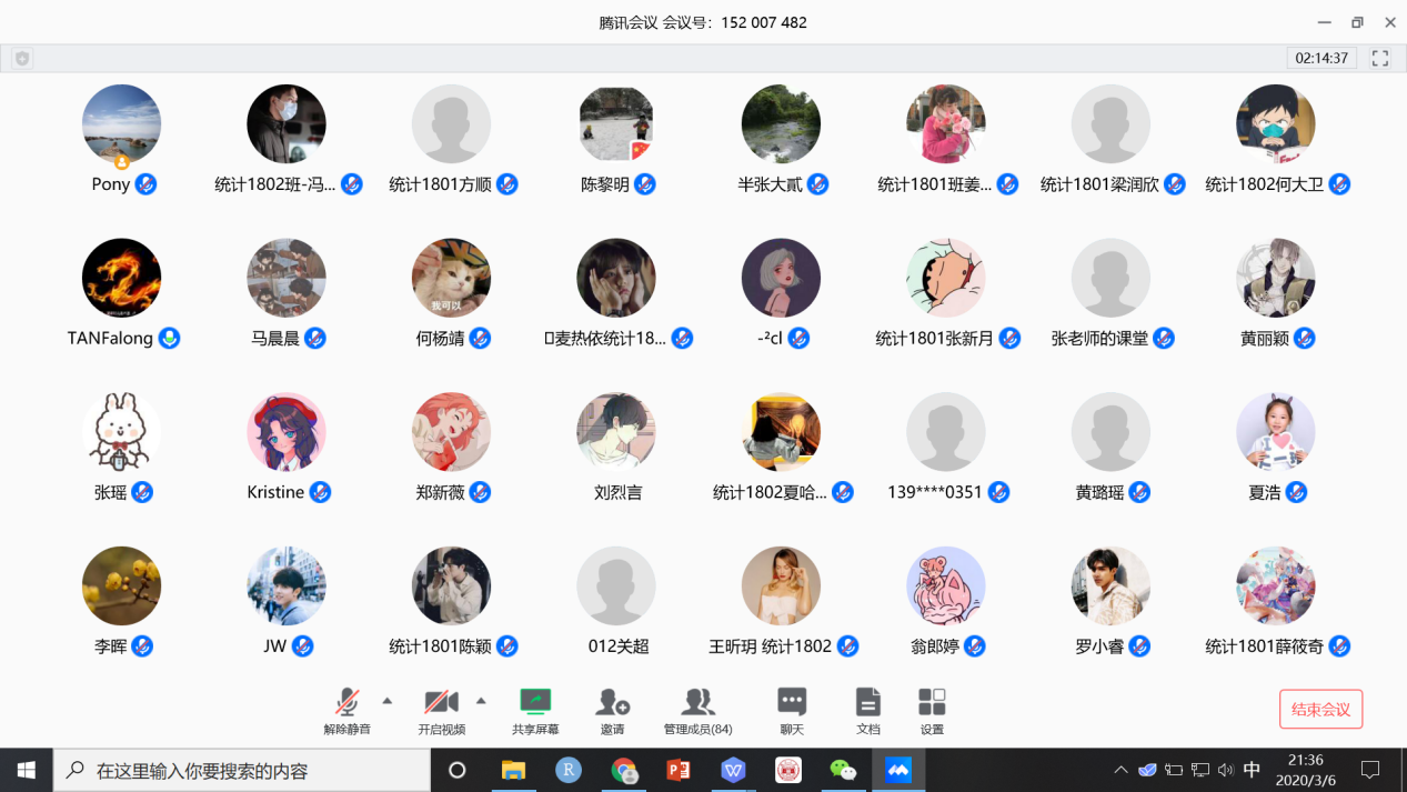 因受新冠肺炎疫情影响,果冻传媒 18级统计类学生专业分流宣讲会利用腾讯会议APP在线上召开。3月6日晚上7:30-10:00,统计学系18级全体学生与业界、学界及毕业生代表嘉宾们共聚专业分流线上宣讲会。共有84人参加了线上宣讲会,其中业界嘉宾为湖南省统计局郭文峰处长;学界嘉宾有果冻传媒 副院长李海奇,院学科建设办公室主任张立军,院工会主席曾昭法,统计学系党支部书记谭朵朵、系主任谭发龙、副系主任王小燕和马守荣,以及周四军教授、任英华教授、陈黎明副教授和王瑛副教授,18级辅导员夏浩老师和院教务办李晖老师;优秀毕业生代表为18届毕业生祝嘉雪、19届毕业生陈兆阳和黄丽颖。