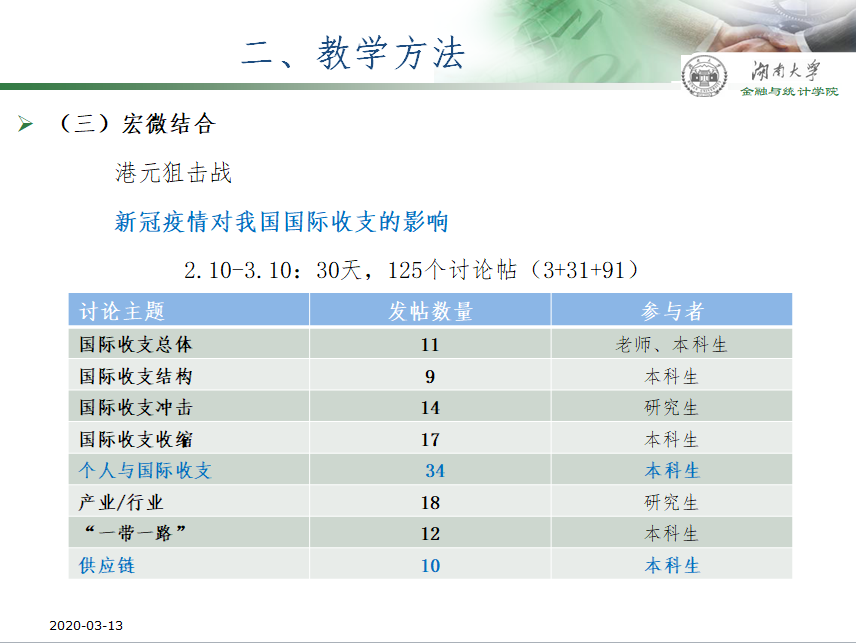 “宏微结合”指的是宏观问题、微观解读,化抽象为具体,赋予问题以物理场景。在“港元狙击战”案例中,引导学生既关注投机者路径,又关注市场间联动,学生达成既深度理解外汇市场作用,还能既见树木、又见森林的教学效果。他结合课堂教学,设计“新冠疫情对我国国际收支的影响”讨论帖,线上讨论持续30多天,讨论主题涵盖国际收支整体、结构、冲击、收缩,个人与国际收支,行业、“一带一路”及供应链,帮助学生拓宽视野、打开思路、构建知识,取得明显效果。“主线担纲”,教师挖掘每一章的逻辑主线与问题主线,以线为纲、纲举目张。