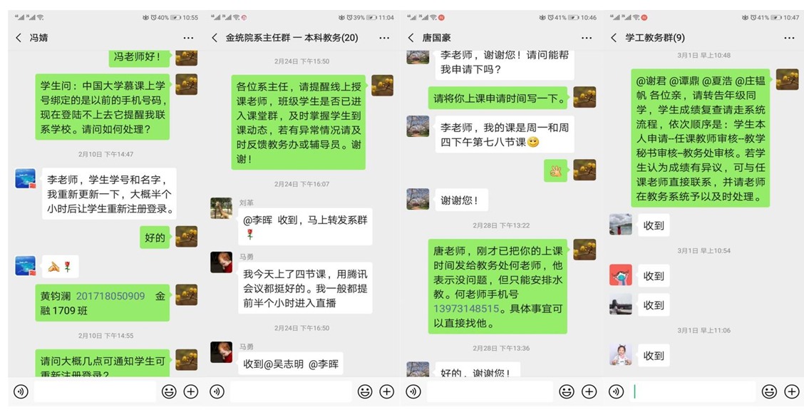 开课后,教务办每天都会收到同学们各种“求救”信息。教务办李晖、吴璇玺老师都会耐心细致地解释,并想办法解决。当得知有少数民族学生,因网络和信号都难以支撑听课、完成毕业论文开题报告提交,教务办两位老师第一时间向学院和教务处报告,及时疏导老师和学生的困惑和焦虑。当得知公共选修课的课堂群有学生未入群,李老师总是不厌其烦地与不同院系联系,提醒并指导学生及时进入在线课堂。当得知学院有老师因在家直播授课不方便时,李老师积极主动与教务处联系,为有困难老师申请在教学楼为学生上直播课,并提醒老师注意做好个人安全防护。