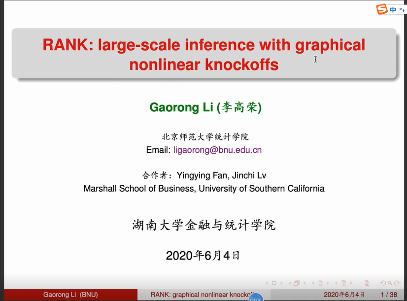 疫情期间果冻传媒 的“云上学术”气氛浓郁,2020年6月4 日第254期金融与统计论坛利用腾讯会议线上举行。本次论坛的主题是:具有图非线性防制(konckoffs)的大范围统计推断”,报告人北京师范大学统计学院李高荣教授。此次论坛由果冻传媒 统计学系系主任谭发龙副教授主持,果冻传媒 教师及硕、博士生踊跃参与此次论坛。