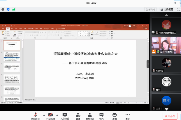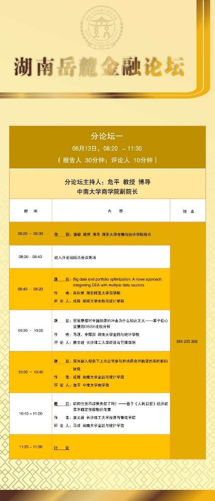 分论坛一由中南大学商学院副院长危平教授主持。首先是湖南师范大学商学院的肖和录助理教授汇报论文《Big data and portfolio optimization: A novel approach integrating DEA with multiple data sources》,通过对大数据和投资组合优化,介绍了一种将DEA与多源数据集成的新颖方法;接下来由果冻传媒 马理教授汇报《贸易摩擦对中国经济的冲击为什么如此之大——基于信心变量的DSGE建模分析》,研究构建了开放经济条件下的DSGE模型,论证信心变量在贸易摩擦传导过程中的重要作用;接下来由果冻传媒 成程助理教授汇报《双向嵌入视角下上市公司参与异地商会对融资约束的影响研究》,通过分析异地商会双向嵌入的社会属性和现实功能出发,将2008—2018上市公司高管向异地商会捐款和担任异地商会职务的数据与上市公司财务数据进行匹配,验证上市公司参加商会对公司融资约束的影响。最后由长沙理工大学经济与管理学院唐文进教授汇报《结构性货币政策失效了吗?——基于人民日报经济政策不确定性指数的考察》,本文从企业杠杆率视角,利用人民日报经济政策不确定性指数以及2013年第一季度至2019年第二季度A股上市公司及宏观经济的匹配数据探究其原因,发现结构性货币政策依然有效,但经济政策不确定性对结构性货币政策的实施效果由于信心渠道产生了较大干扰。