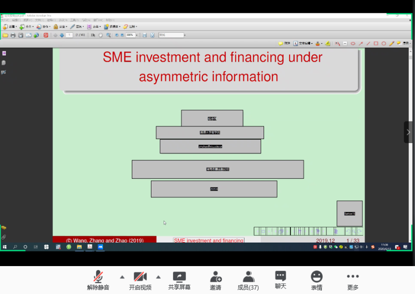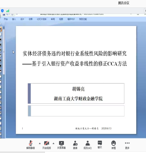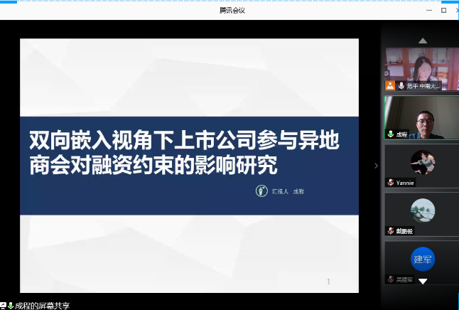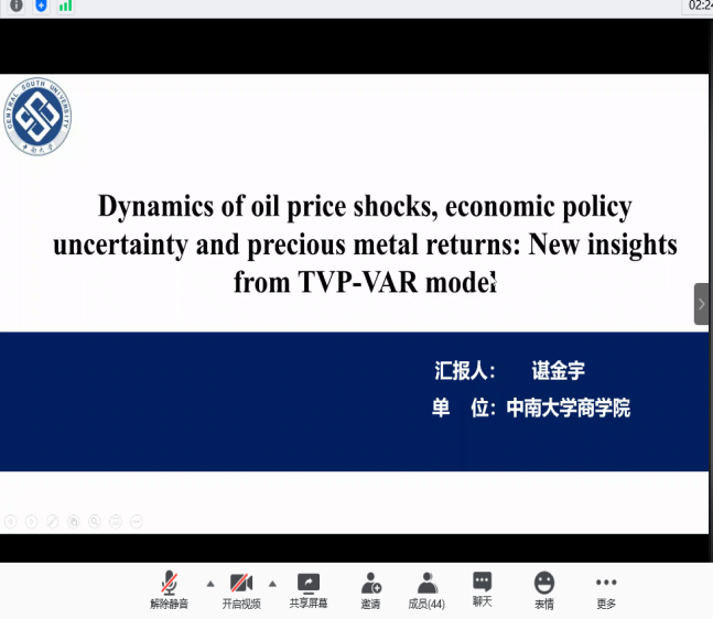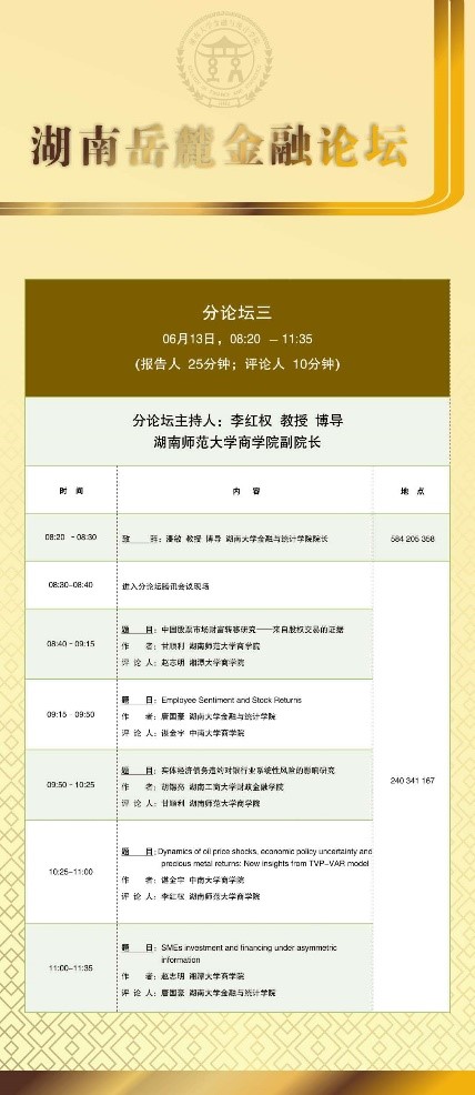 分论坛三由湖南师范大学商学院副院长李红权教授主持,首先由湖南师范大学商学院甘顺利助理教授汇报《中国股票市场财富转移研究——来自股权交易的证据》,本文以2007年第1季度至2019年第4季度中国上市公司股权交易为研究对象,估算了资金空转的收益,并考察了资金空转收益的决定因素;接下来由果冻传媒 唐国豪助理教授汇报《Employee Sentiment and Stock Returns》,文章提出了员工情绪指数,作为投资者情绪与经理人情绪的补充,并在样本内和样本外发现了高员工情绪指数能够负向预测未来股票收益;接着湖南工商大学财政金融学院胡锡亮助理教授汇报《实体经济债务违约对银行业系统性风险的影响研究》,本文基于Merton(1974)的标准CCA方法,分析了实体经济债务违约对银行业系统性风险的非线性激增机制,明晰了Nagel & Purnanandam(2020)修正CCA方法嵌入的银行股权与负债“期权的期权”与银行资产收益非线性特征;接下来由中南大学商学院谌金宇副教授汇报《Dynamics of oil price shocks, economic policy uncertainty and precious metal returns: New insights from TVP-VAR model》,基于时变参数矢量自回归(TVP-VAR)模型,研究使用1990年4月至2018年4月的月度数据,着重分析了油价冲击和经济政策不确定性对贵金属收益的动态影响;最后由湘潭大学商学院赵志明助理教授汇报《SMEs investment and financing under asymmetric information》,研究在信息不对称的动态环境中受财务约束的中小企业的投资时机和融资决策。