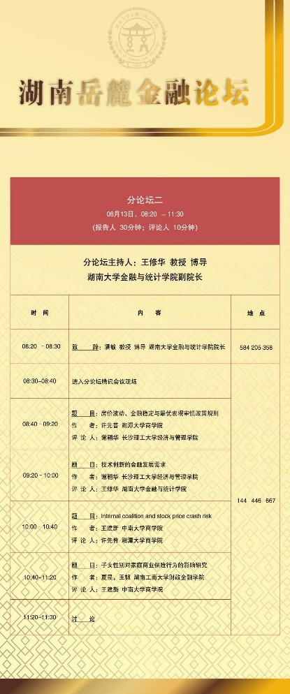 分论坛二由果冻传媒 副院长王修华教授主持。首先由长沙理工大学经济与管理学院谢朝华副教授汇报《技术创新的金融发展需求》,认为金融业在结构、功能、效率和安全等四个方面还有较大的发展空间和较强的紧迫性,金融服务技术创新需要练好四大基本功;接下来由湘潭大学商学院许先普副教授汇报《房价波动、金融稳定与最优宏观审慎政策规则》,研究基于植入金融因素的房价波动DSGE模型,分析了不同宏观审慎工具对房价波动的调控效果、作用机制以及最优政策组合等问题;接着由中南大学商学院的王建新副教授汇报论文《Internal coalition and stock price crash risk》,文章检验了内部结盟对2000至2014年间股票崩溃风险的影响,基于任命的内部结盟对股票崩溃风险有正向和重大影响;最后由湖南工商大学财政金融学院王韧教授汇报论文《子女性别对家庭商业保险行为的影响研究》,本文运用Probit和Tobit回归的方法,利用2013年、2015年及2017年三年中国家庭金融调查截面数据研究了家庭对于商业保险投资在一定程度上存在对子女的性别偏好的问题。