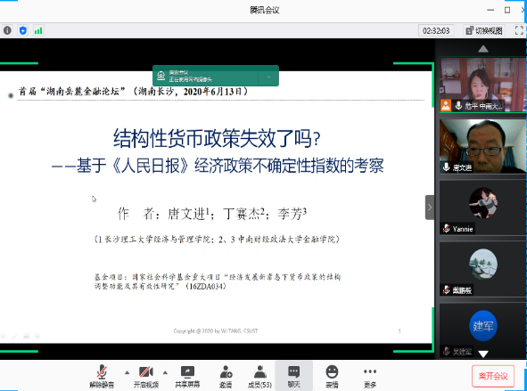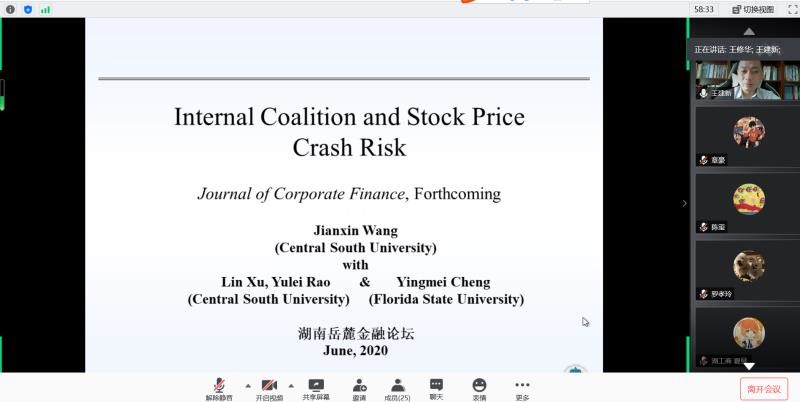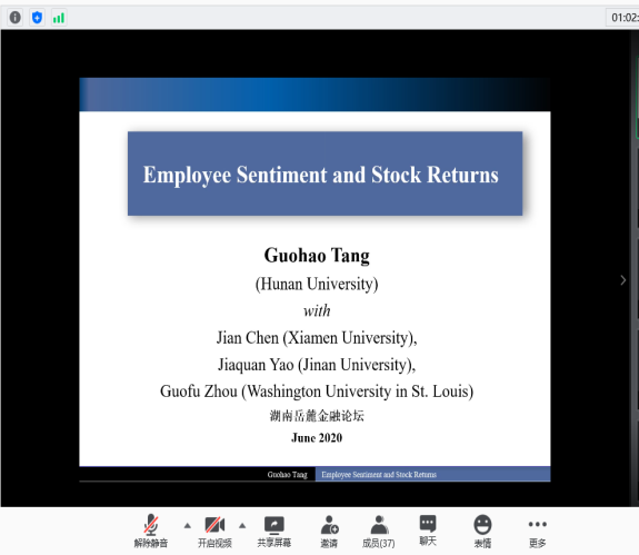 2020年6月13日,由果冻传媒 主办,联合中南大学商学院、湖南师范大学商学院、湘潭大学商学院、长沙理工大学经济与管理学院和湖南工商大学财政金融学院发起的首届“湖南岳麓金融论坛”线上召开。果冻传媒 院长潘敏教授致开幕辞,他表示非常期待省内六所高校联合的首次金融开讲,并与各位参会嘉宾分享了关于省内金融学术交流平台的构想与展望,希望今后各高校之间能有更多的学术合作与交流。本次论坛设立三个分论坛,共有126名师生参加此次线上论坛。