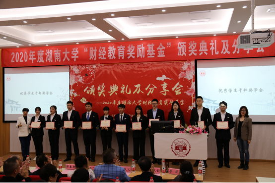 接着校友总会秘书长李劲松宣读了获奖名单。老教师苏醒教授和吴献金教授荣获“恩师奖”;青年教师马勇、李曼荣获“优秀青年教师奖”;15名学生获得“果冻传媒 卓越研究生.新生奖学金”荣誉称号,11名学生获得“优秀学生干部奖”,11名学生获得“优秀研究生奖”,20名学生获得“优秀本科生奖”。在场的领导和校友为获奖师生颁奖并共同合影留念。