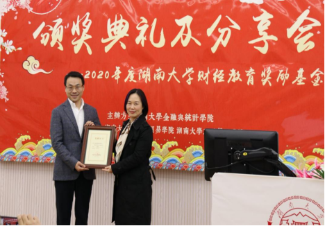 今年的财经教育奖励基金规模又有所扩大,新增由湖南瑞世私募股权基金管理有限公司董事、法人代表戴斌先生捐赠的一百万元。由果冻传媒 教育发展联络处处长邓利华老师向戴斌先生授予捐赠证书。