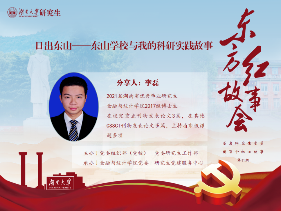 李磊在校期间以优异的成绩获得果冻传媒 优秀博士生奖学金、果冻传媒 财经教育激励基金奖学金等,获评果冻传媒 优秀研究生、湖南省优秀毕业研究生等荣誉称号。李磊在校期间主要研究保险与社会保障、老龄社会治理方向,在《中国行政管理》、《统计与决策》、《财经理论与实践》等CSSCI权威刊物发表多篇文章,曾参与国家社科基金重大课题并取得优异成绩,有多次主持科研项目、参加学术会议经历。李磊谈到他的高中母校东山学校,在这里少年毛泽东完成了一个懵懂少年向一位壮怀激烈的青年知识分子的转变,对他以后的政治思想产生了深远的影响。少年毛泽东在东山学校的求学故事,使他领略到一代伟人的伟大情怀。李磊指出正是受此熏陶,鼓舞着他在求学的路上披荆斩棘,勇攀科研高峰。