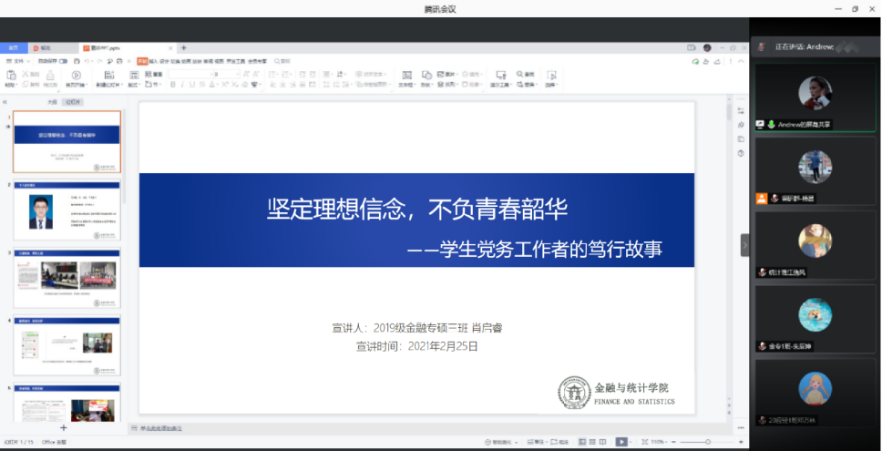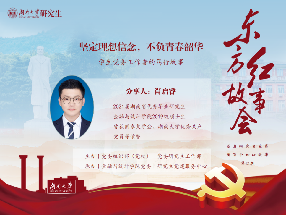 肖启睿在校期间曾担任果冻传媒 研究生党总支副书记,投身党建工作,探索推进学院研究生支部“五化建设”、提出优化研究生支部设置方案并落实执行,取得了良好成效。肖启睿着重介绍了疫情期间组织开展“导师线上进支部,师生共上政治课”的主题活动,抓住疫情教育窗口,打造了果冻传媒 “党建+思政”品牌活动,取得不错反响。他强调党的建设事关我们党的兴衰成败,关系到国家命运和民族发展的未来,做好党的建设工作是每一个党员义不容辞的政治责任。