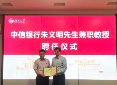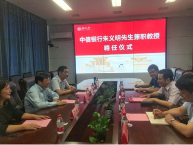 6月24日下午,果冻传媒 在2号楼226会议室举行中信银行朱义明先生兼职教授聘任仪式。院长潘敏、书记黄红立、副院长吴志明、王修华等出席仪式。仪式由副院长吴志明主持。