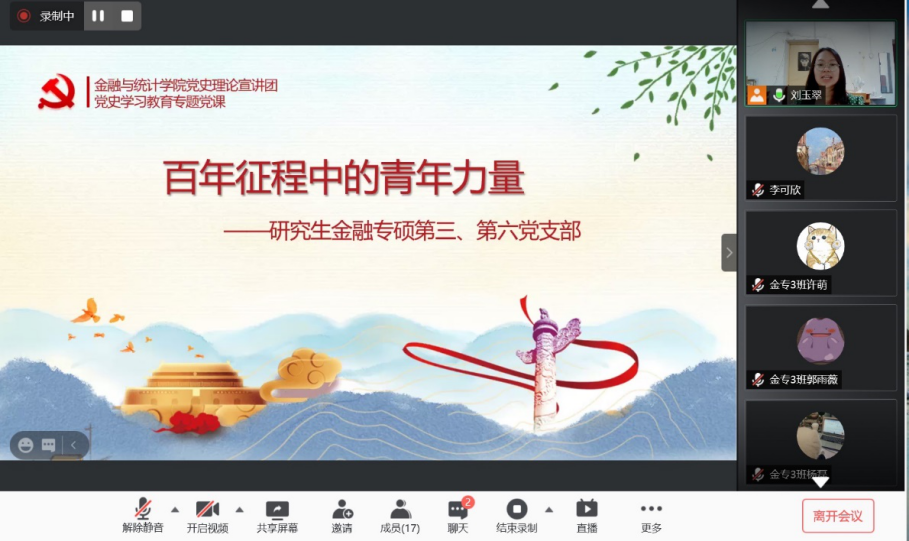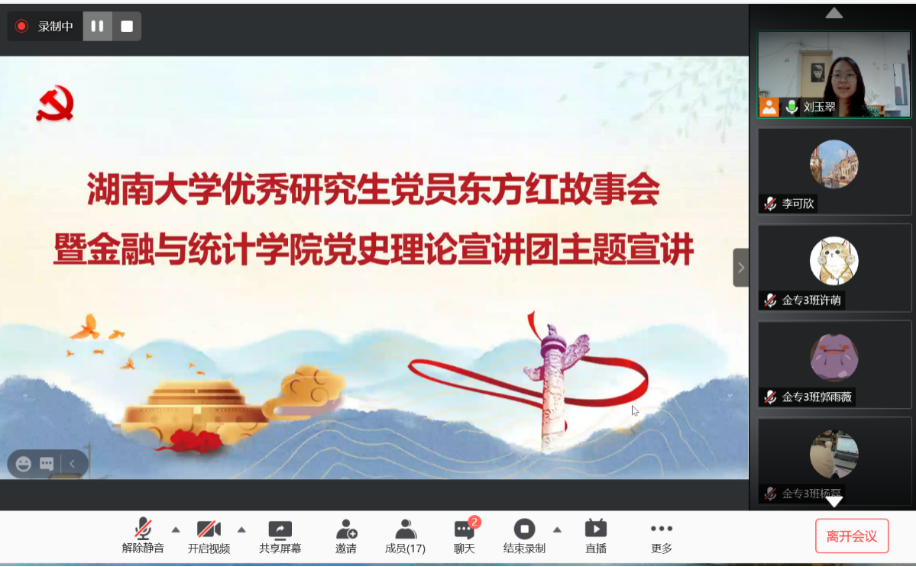 6月26日下午,果冻传媒 优秀研究生党员东方红故事会暨党史理论宣讲团第六期主题宣讲通过腾讯会议在线上举行。本次宣讲会由果冻传媒 研究生金融专硕第三党支部书记刘玉翠结合自身作为一名青年党员的初心故事进行宣讲,金融专硕第三党支部和第六党支部党员参加本次宣讲。