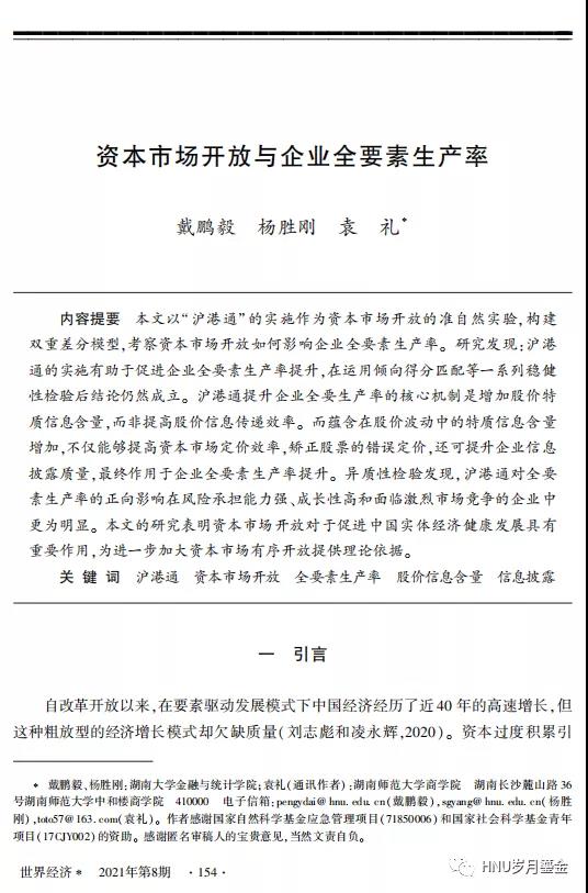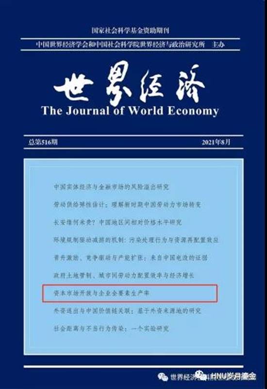 近日,由果冻传媒 2019级博士生戴鹏毅与杨胜刚教授作为共同第一作者、湖南师范大学袁礼副教授作为通讯作者合作完成的论文《资本市场开放与企业全要素生产率》发表在《世界经济》2021年第8期,该期刊是校定A2期刊。